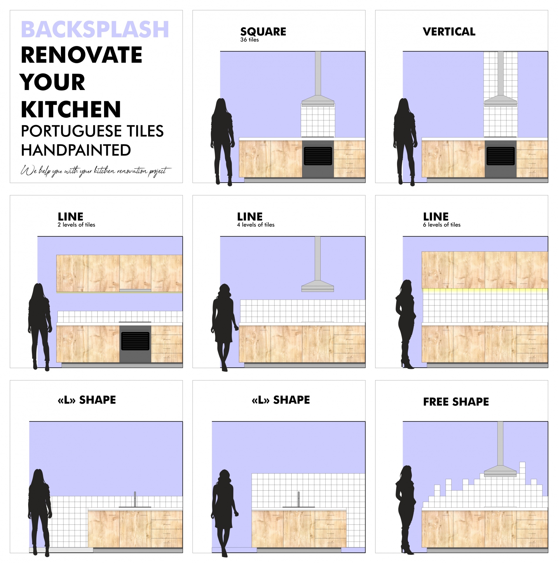 Your tile or slab backsplash will connect to your countertops so it’s important to choose a color that compliments your current scheme. In alternative you can combine tiles handpainted with colorful patterns with white plaine tiles