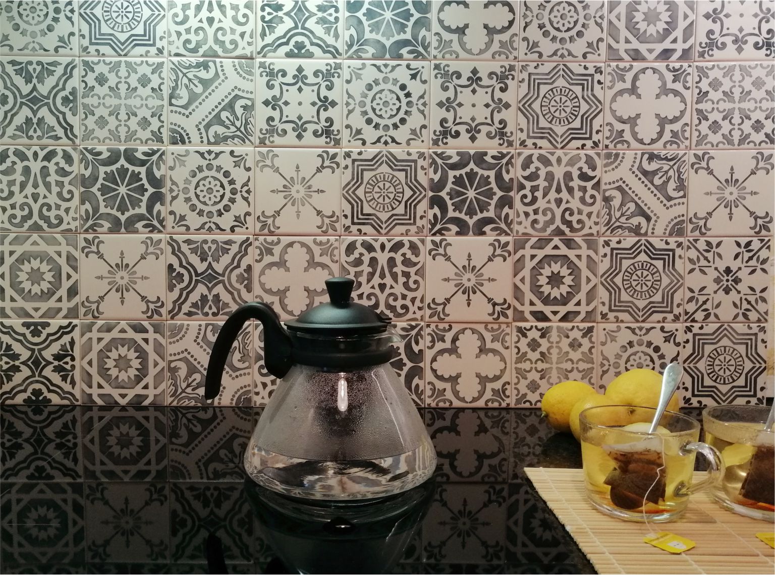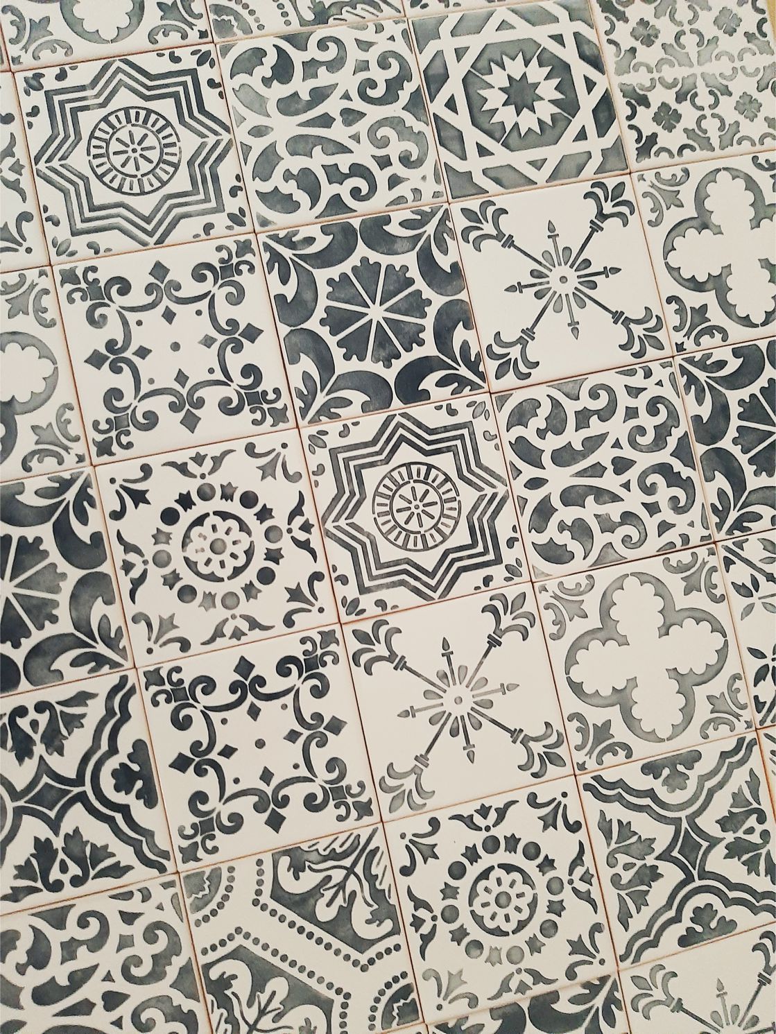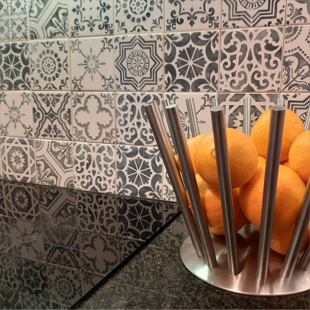Backsplash with Portuguese Tiles hand painted in Warm Grey