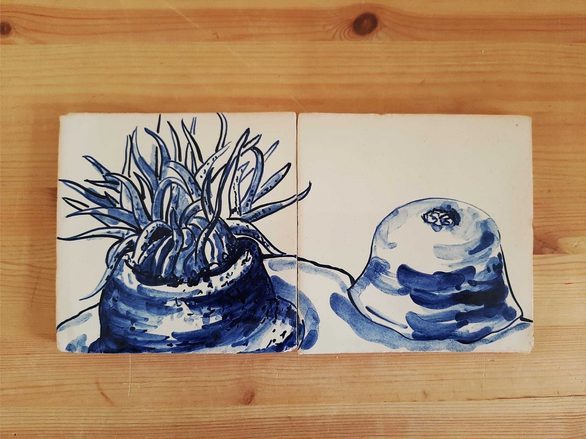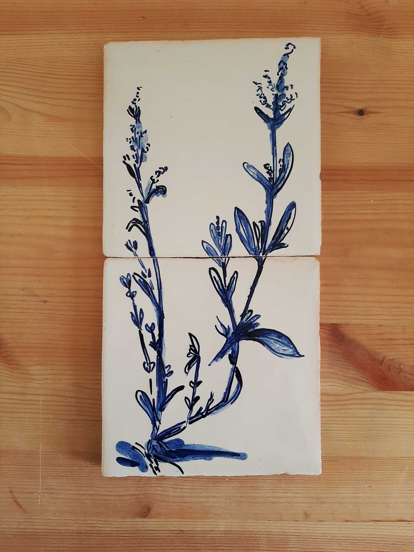 Monochrome tile mural, hand painted in cobalt blue on a white background.