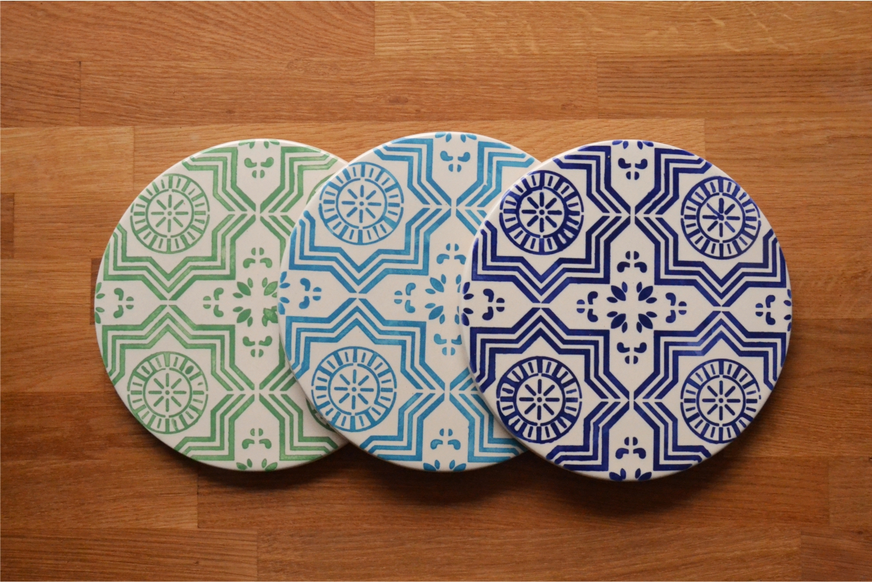 Hand painted individually Size Circular – diameter 20 cm Back with 4 mm cork Painted according to 19th century facade tile techniques
