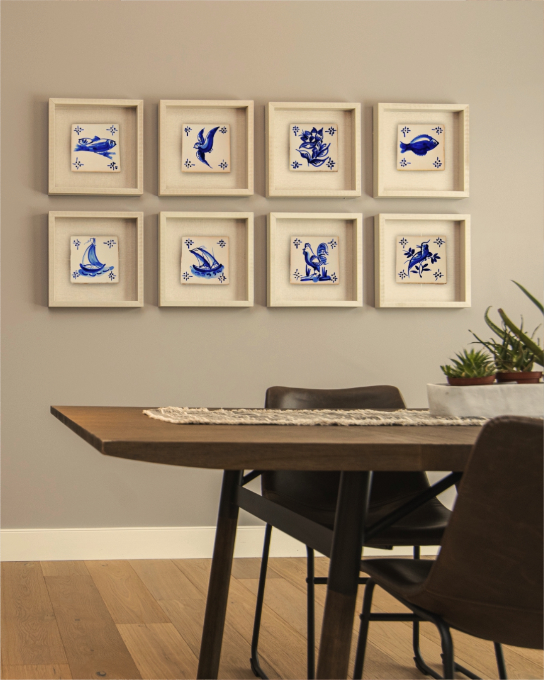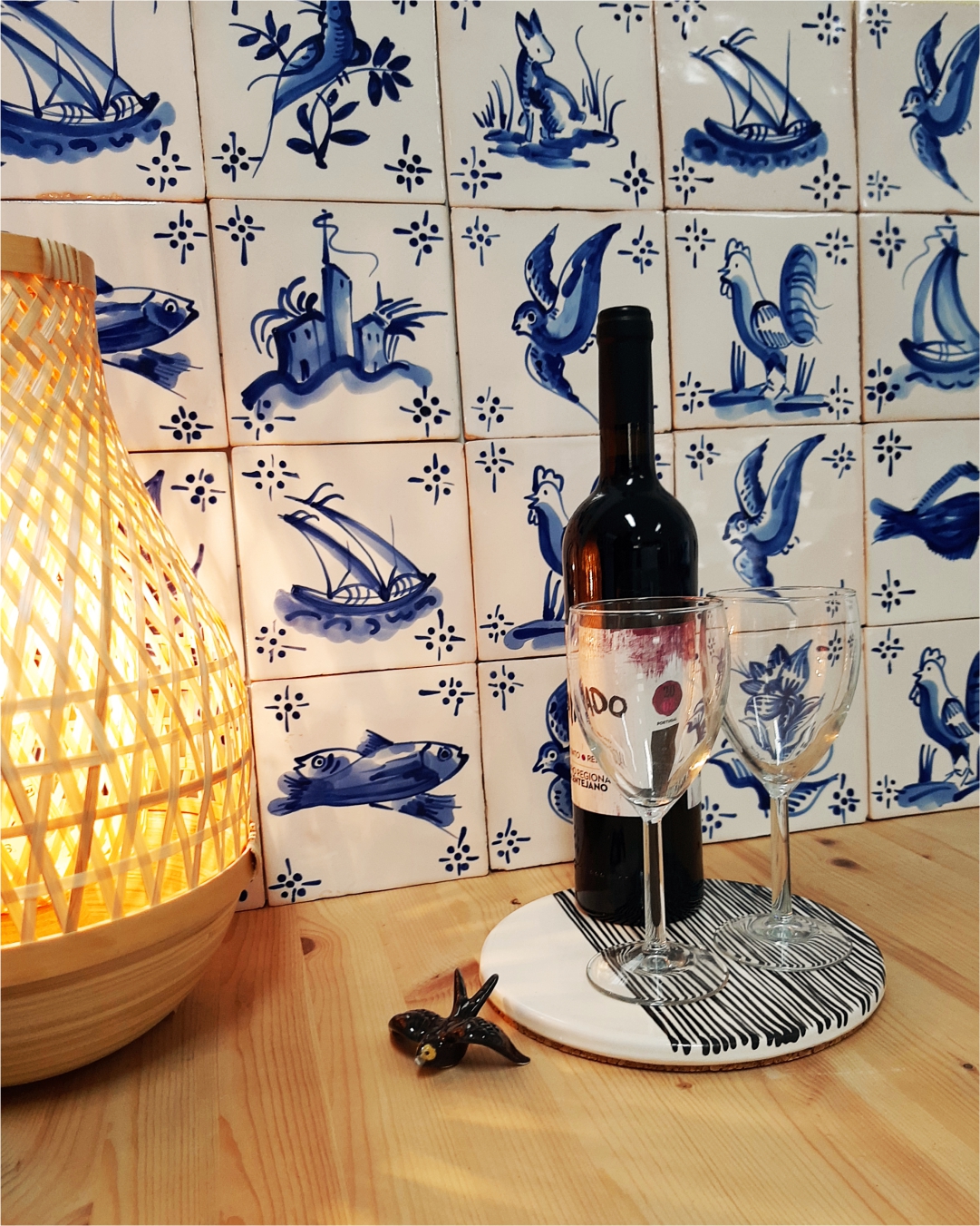Each tile represents a single composition (flower, animal, etc., or even a description of more complex scenes). In Portugal during the 18th century, the plain blue figure kind with decorative elements in corners to help the visual unity between the various tiles became more popular. Placed especially in kitchens and staircases, they are also applied in the religioous architecture.Hand painted individually in handcraft, according to the traditional - processes and techniques of 18th century