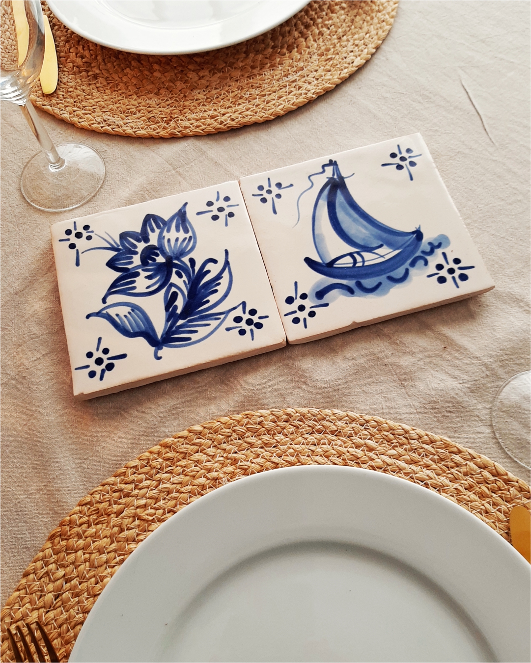 Each tile represents a single composition (flower, animal, etc., or even a description of more complex scenes). In Portugal during the 18th century, the plain blue figure kind with decorative elements in corners to help the visual unity between the various tiles became more popular. Placed especially in kitchens and staircases, they are also applied in the religioous architecture.Hand painted individually in handcraft, according to the traditional - processes and techniques of 18th century