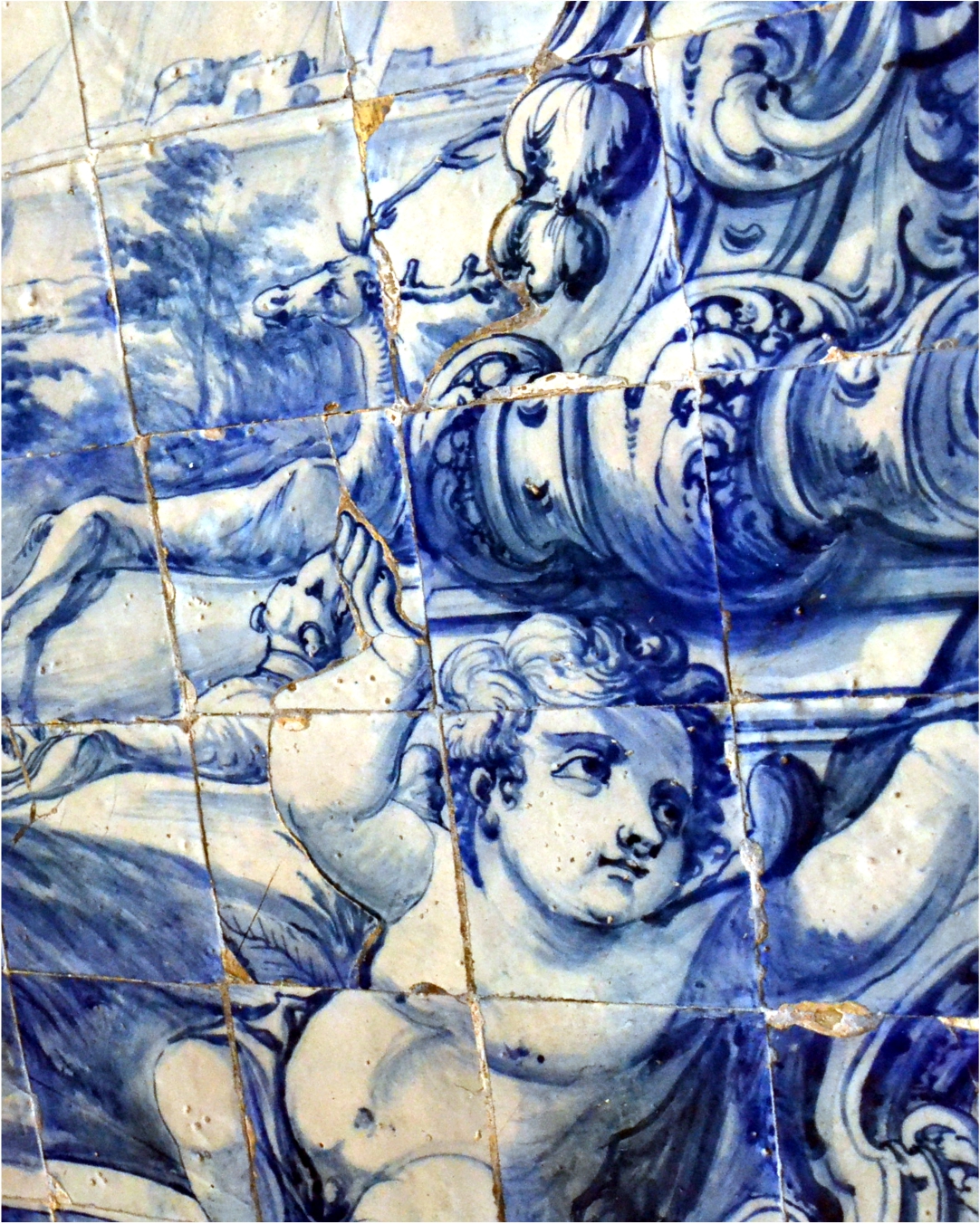 BAROQUE . The term “gold over blue”, takes us to the period in which the magnificent Baroque blue painted tiles (cobalt oxide) as well as other arts, were often associated with the use of gilt. Their theatrical and scenography characteristics recreate fictional spaces through the use of perspective. They had an extraordinary spread throughout the Portuguese territory and the former Portuguese and especially in Brazil.