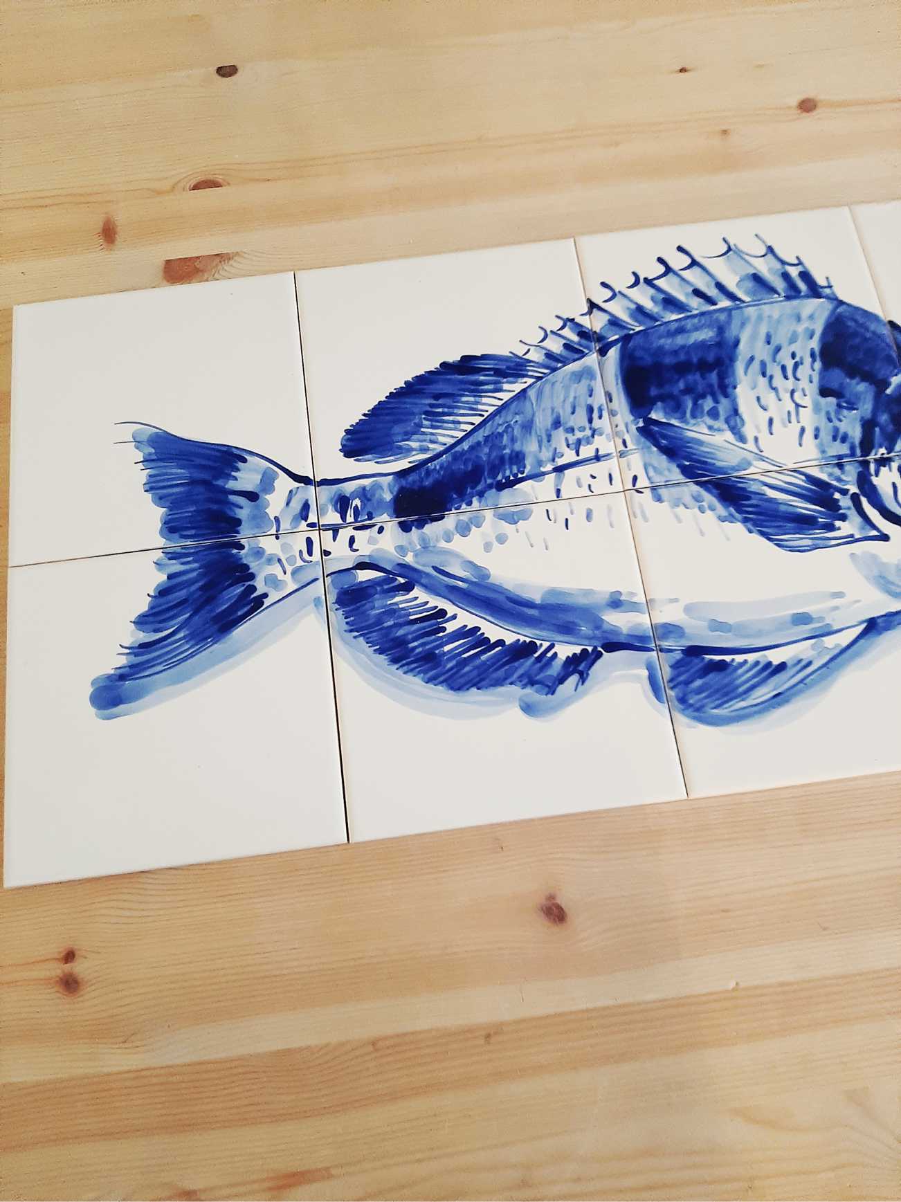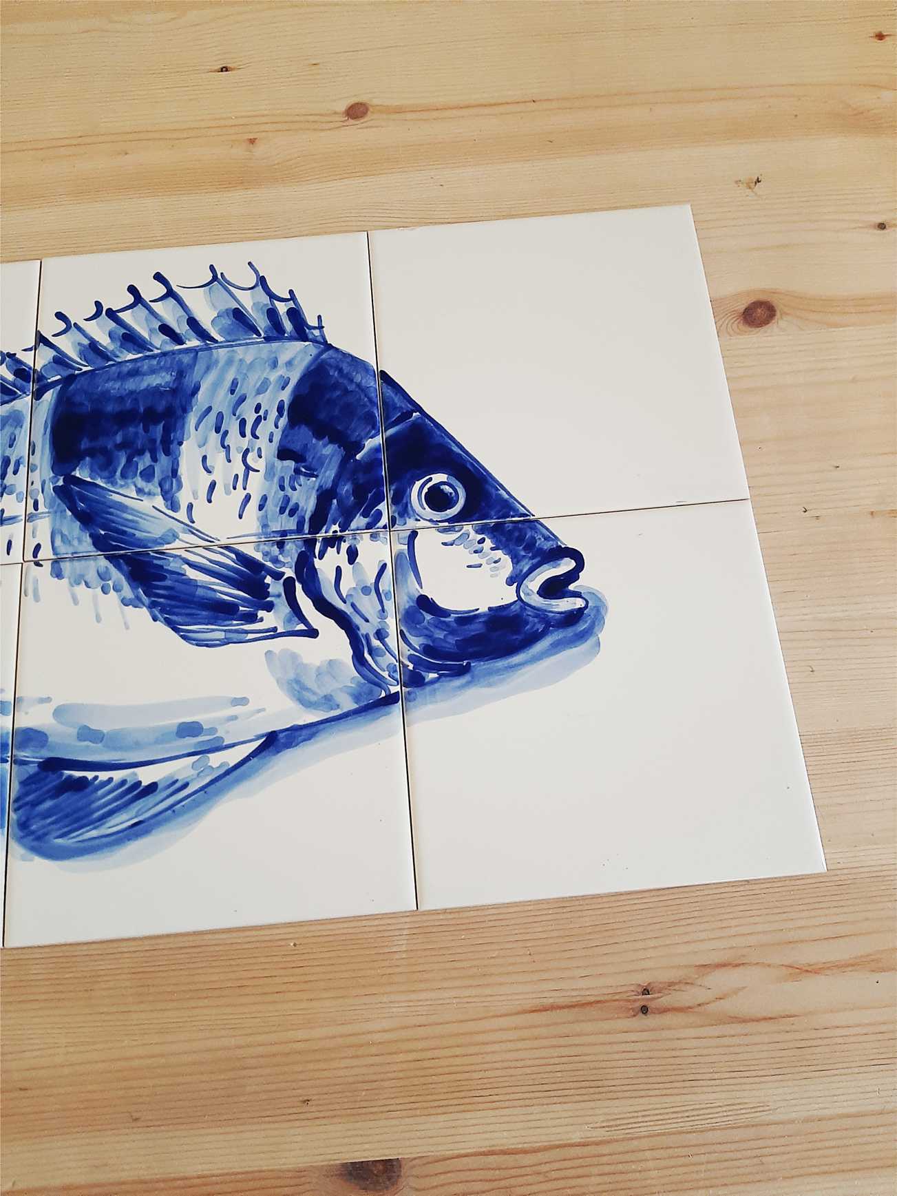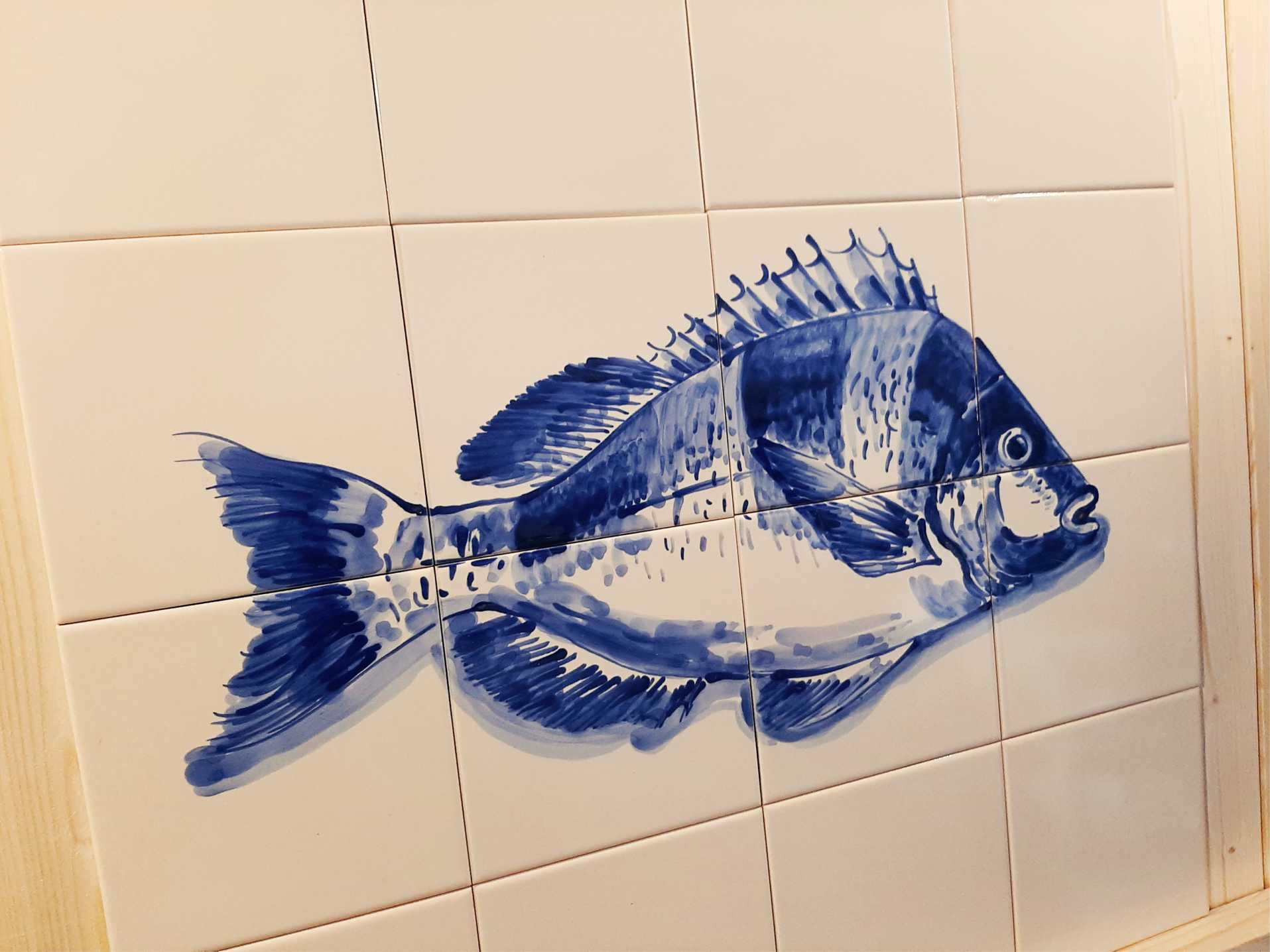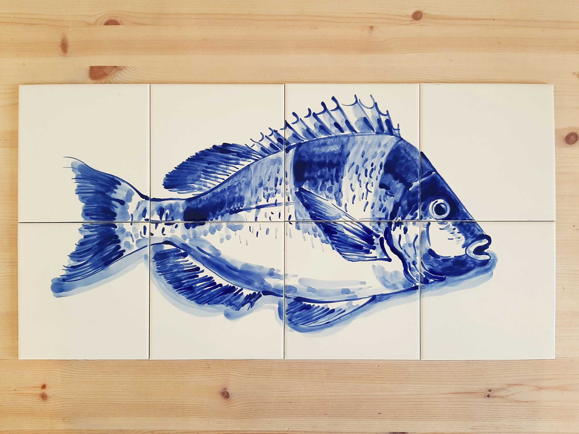 Portuguese Tile Mural, Fish, hand painted in cobalt blue