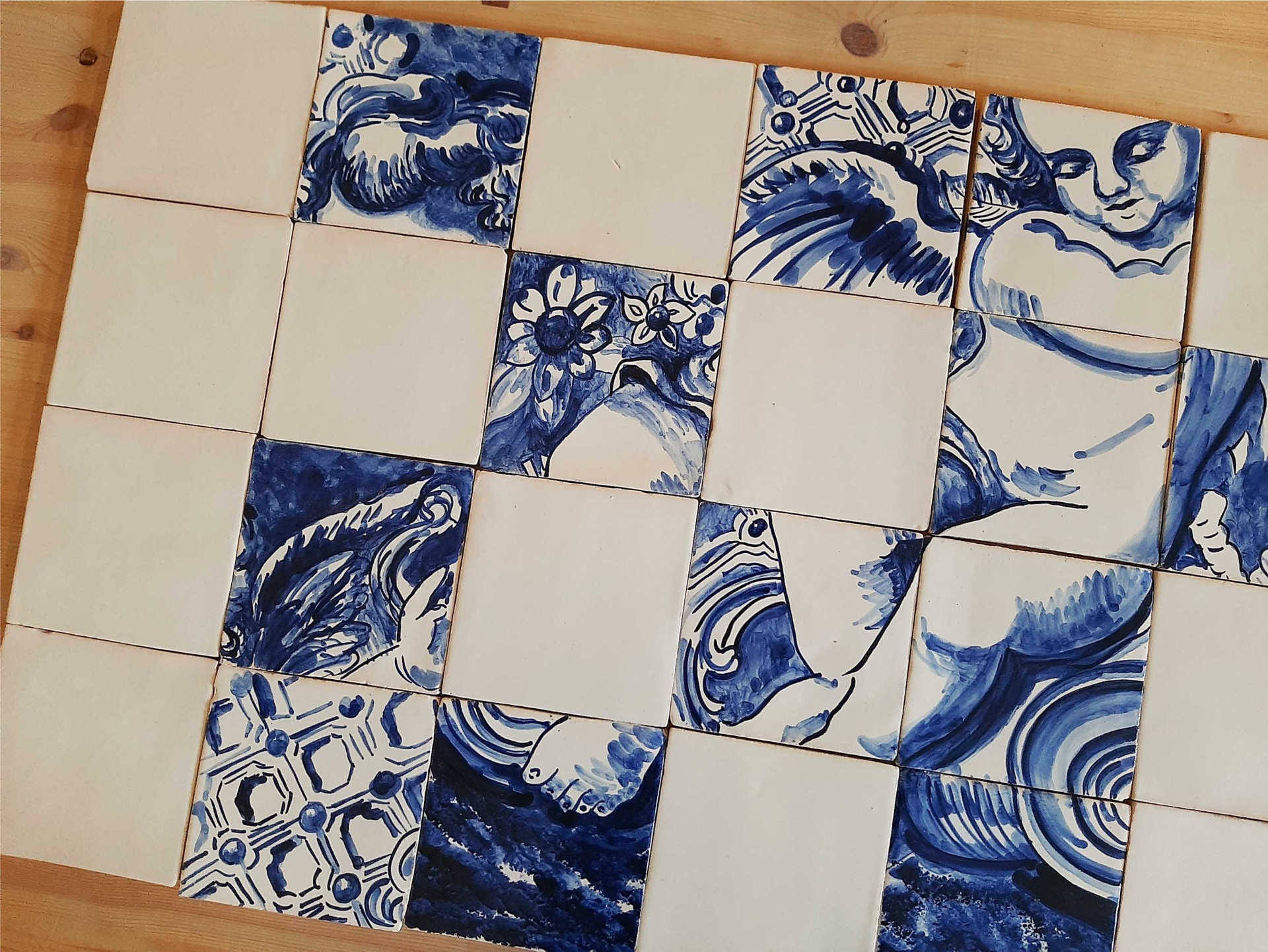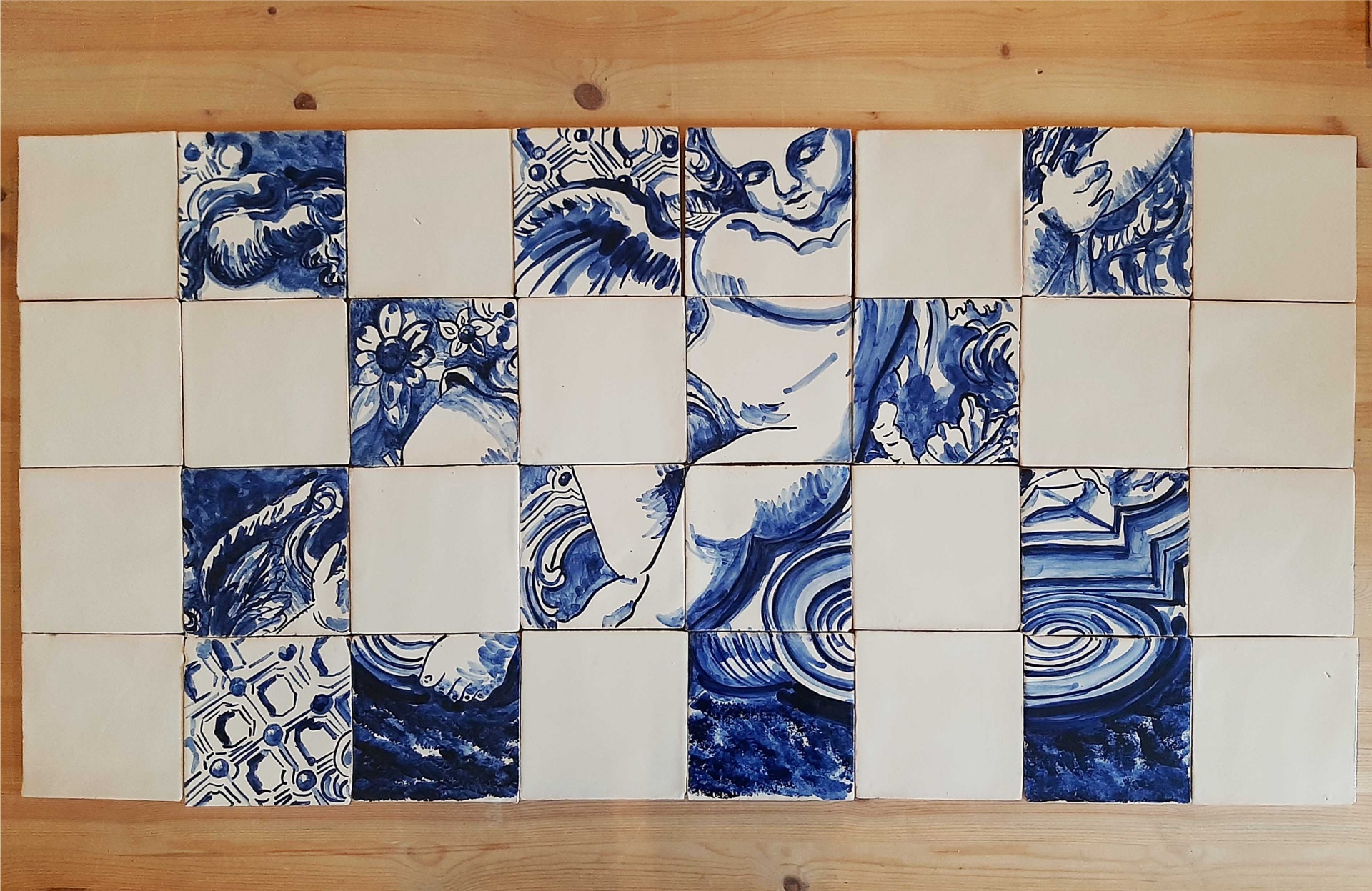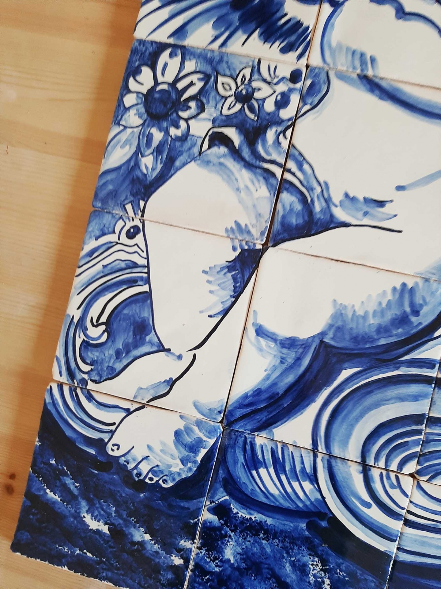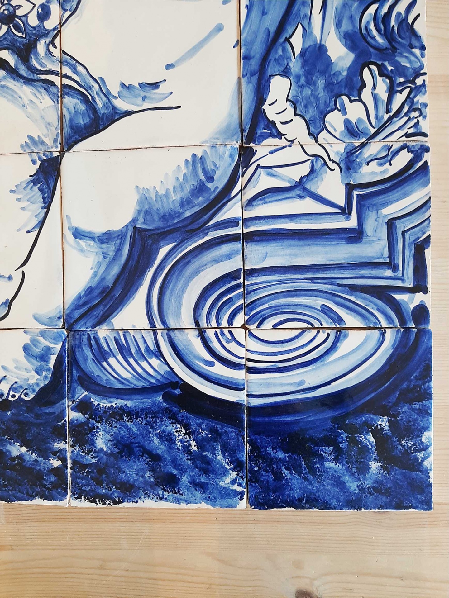 Monochrome tile mural, hand painted in cobalt blue on a white background.