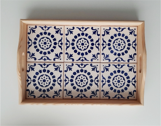 Home Medium Size Tray with portuguese tiles handpainted model C Tray with portuguese tiles handpainted model C 64,90 € Discount of %. IVA included. Buy Contact Add to wishlist Tray with portuguese tiles handpainted This tray covered with 6 hand-painted Portuguese tiles, allows it to be used as a trivet for hot dishes, with standing high temperatures. Size: 33 cm x 22 cm Alternatively it can be used as a decorative piece on a shelf The patterned tiles look lovely against the natural wood and would make a perfect gift for a loved one. Tags blue tilestraytable decorserving platerperfect gift Share